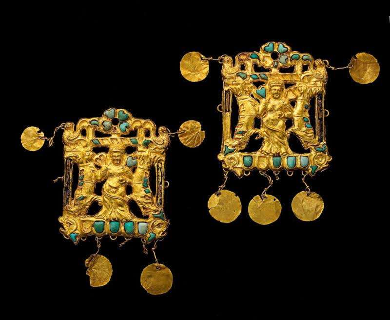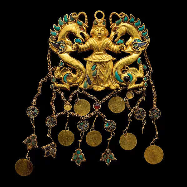 女神动物纹坠饰 出自蒂拉丘地6号墓(公元25年-50年)。图片来自清华大学艺术博物馆