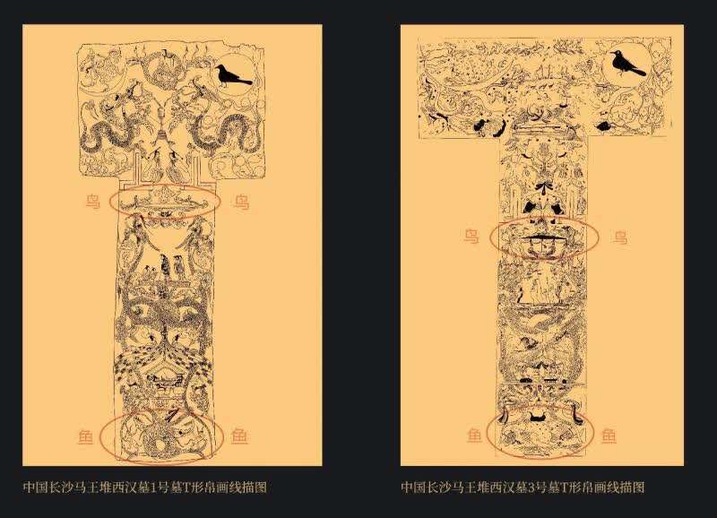 阿富汗文物中的女性饰品也很惊艳。蒂拉丘地遗址等级最高的6号女性墓主,其生前黄金饰品上有更多元素与中国古代图案不谋而合。如镶嵌松石的女神动物纹坠饰上,女神脚踏的地面两端有鱼龙头象;身侧的两边立柱是尾部呈现为茛苕叶形的龙,巧妙贯穿上下左右;头顶花形拱门两端柱头上站立双鸟。这种图案构成与西汉马王堆一号汉墓T形帛画所呈现世界的基本模式若合符节,都是以鸟、龙与鱼作为导引,将画面区分为天上、人间、地下三段。类似构图在长沙子弹库楚墓的《人物御龙图》中亦有呈现,呈现出奇幻圆满的身后世界。