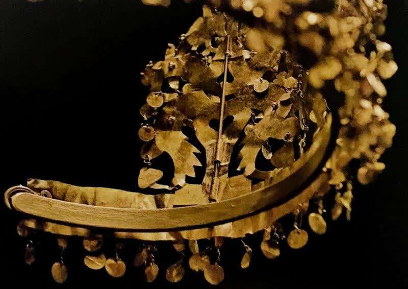 华丽的树形王冠也出土于6号墓。镂空花形树上满是可拆卸的轻如薄翼的金缀叶,明灭间连缀起一部亚洲装饰美学的交流史。王冠可能表现一种生命树,类似造型在三星堆祭祀坑也曾出现过,其源头可以追溯到古埃及和两河流域。这类步摇作为一种贵族的头部装饰,后来在整个欧亚大陆广为传播。