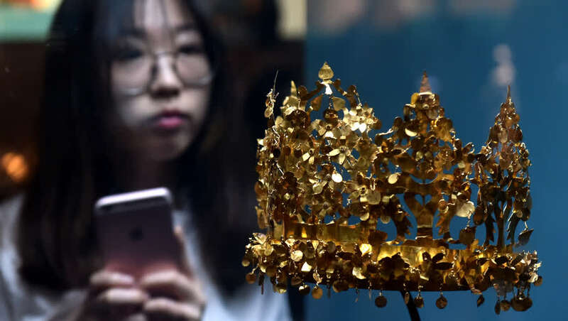 题图为阿富汗国家宝藏亮相中国,观众在郑州博物馆参观展出的金冠。图片来自新华社