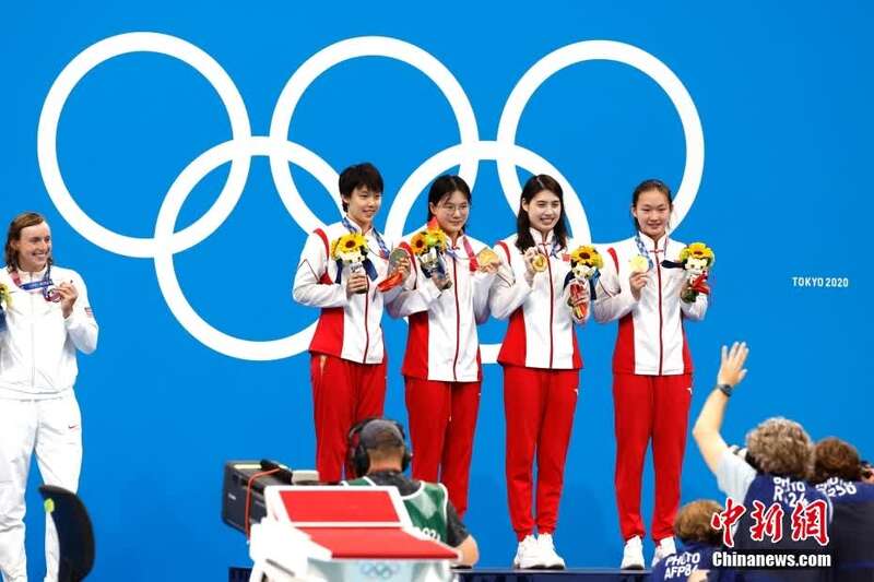 资料图:当地时间7月29日,东京奥运会女子4x200米自由泳接力决赛中,由张雨霏、杨浚瑄、李冰洁和汤慕涵组成的中国队以7分40秒33的成绩夺得冠军,并打破世界纪录。这也是中国代表团在此次奥运会上的第14枚金牌。图为颁奖仪式。中新社记者 富田 摄