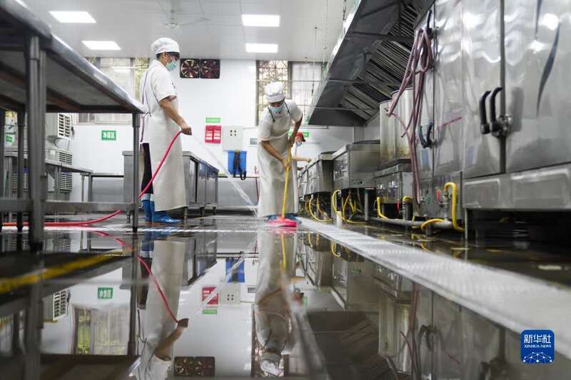 8月25日,在重庆市北碚区朝阳小学,工作人员在清洗厨房地面。新华社发(秦廷富 摄)