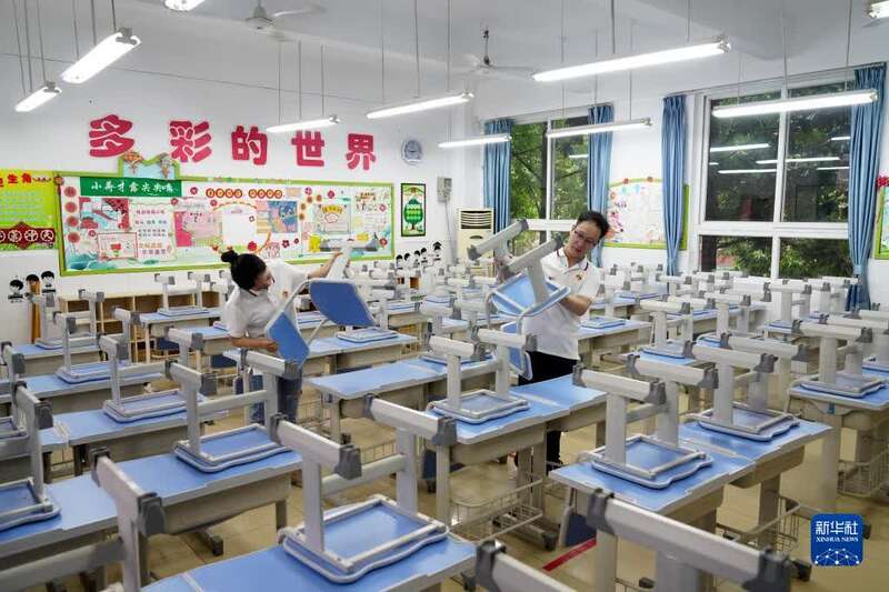 8月25日,在重庆市北碚区朝阳小学,教师在整理教室桌椅。新华社发(秦廷富 摄)