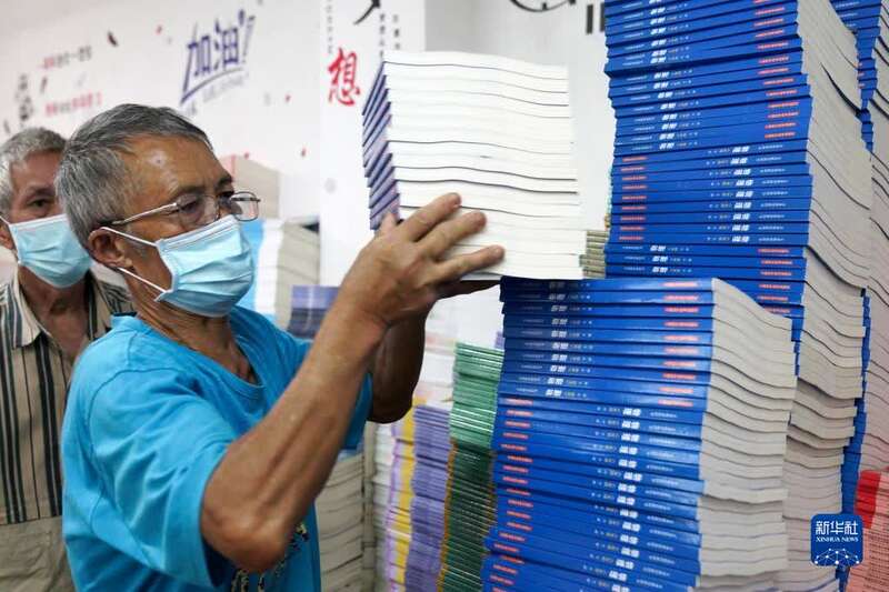 8月25日,在重庆市江北中学,工作人员在分拣课本。新华社发(秦廷富 摄)