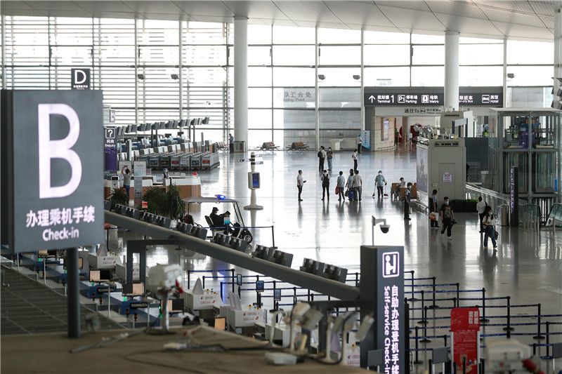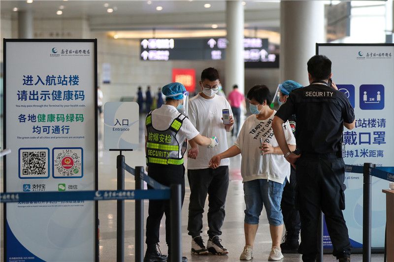 2021年8月26日,江苏南京,禄口国际机场恢复国内航班运行。旅客通过查验健康码、测量体温后方可进入航站楼。