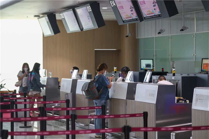 2021年8月26日,江苏南京,禄口国际机场恢复国内航班运行。南京禄口国际机场T1航站楼,HO1721航班飞往成都的旅客办理乘机手续。