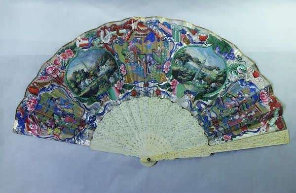 扇骨为象牙,外骨上下浮雕山水人物,纹饰繁密,层次丰富,锋棱毕露,内骨轻薄片状,以牙丝纹铺地饰山水人物纹,凸显广州牙雕工艺特色。扇面以彩绘官邸庭园人物及广州风景为主题,人物面部用象牙贴绘。