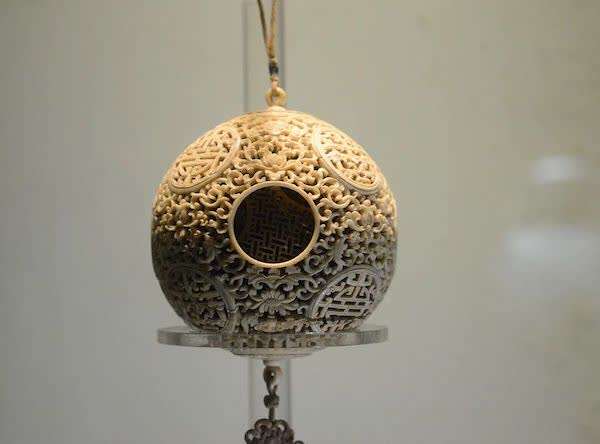 广州牙雕工艺可追溯到汉代,以精细闻名,镂雕象牙球为其代表之一,明人曹昭《格古要论》中称之为“鬼功球”,“鬼功”或作“鬼工”,分选料、磨圆、钻孔、分层、雕花、透雕六道工序,内分数层,层层相套,转动自如,图像交错隐现,令人叹为观止。