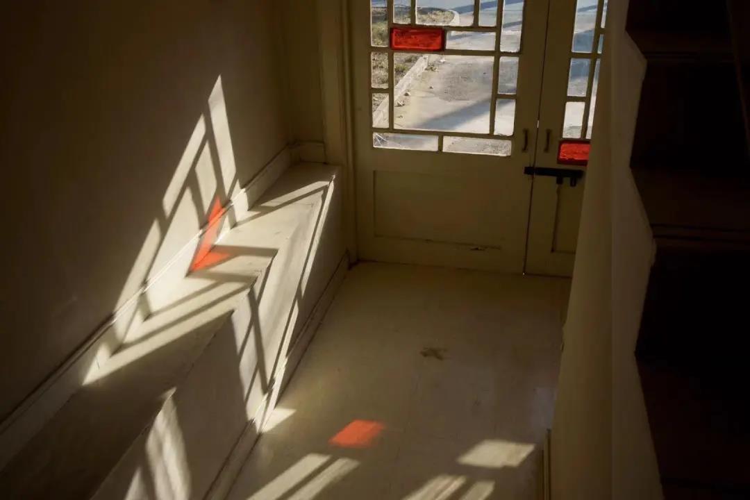 玻璃纸也是遍布静园四院的,用水和肥皂安装在窗花上;谁都可以把它们撤置、重新安装。清晨到中午,这些窗花是一幅幅随着树叶的舞动、鸟和人的来去不断重构的画。下午,阳光洒进院子,窗花和玻璃纸便会在地上画光、影、红的点,随着太阳的移动,点会延成线,线会延成面。