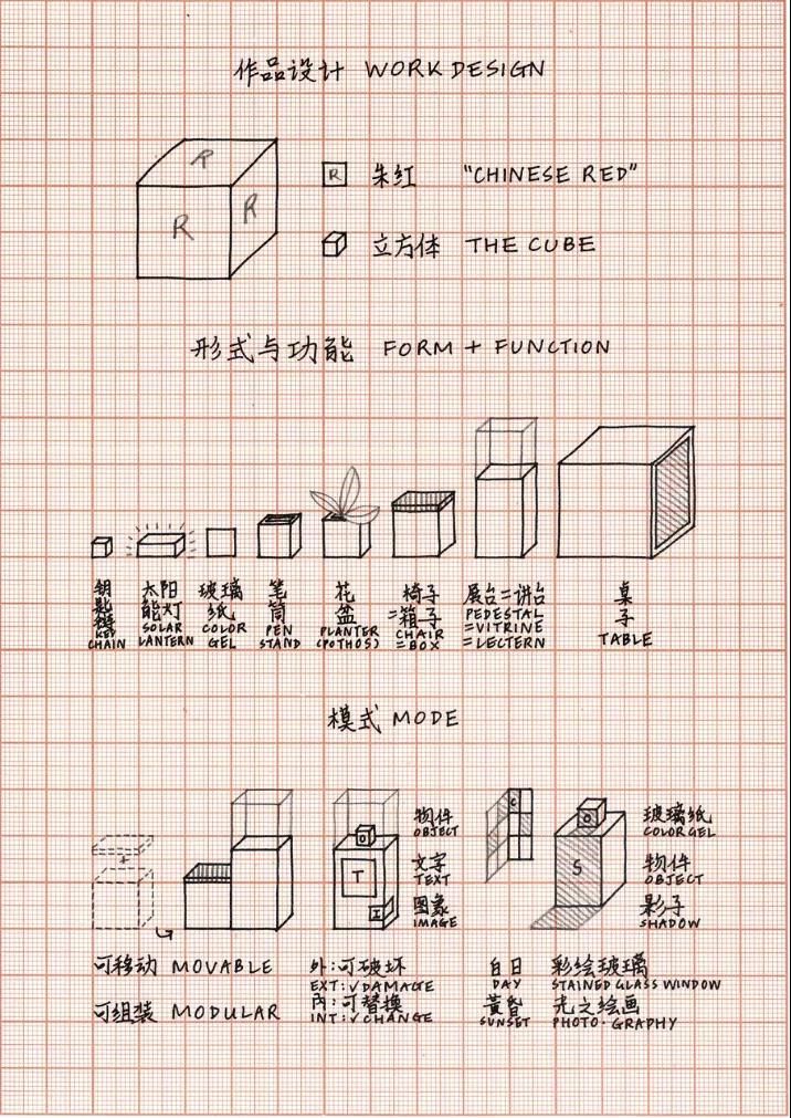 学生团队一起做了合共192个立方体:100个拇指大的钥匙扣、36个掌心大的笔筒、30个张开的手掌大的花盆、18个到膝盖高的椅子(翻过来是空心的箱子)、2个到手腕高的桌子,以及6个到手肘高的展台(在撤展后可以搬进教室当讲台)。所有立方体都是流动的,任何人都可以在静园四院里改变它们的位置。