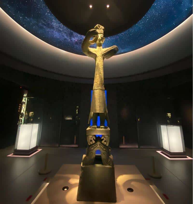 在奉贤博物馆的展厅中,青铜大立人像(复制品)被置于梯形高台之上,顶面饰以环形垂面,同时制作出星河璀璨的效果,烘托古蜀祭祀场景中神圣的氛围。这个大立人像高高在上,气度不凡,吸引观众流连忘返,也不禁好奇:他两臂环抱,两手呈虚握的圈圈,那么,他手里原本拿的是什么?