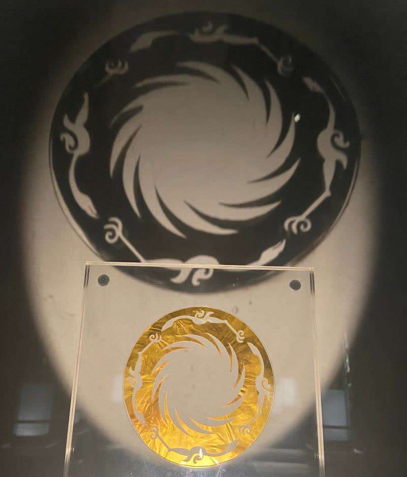 在“古蜀之光”展上,130余件/套珍贵展品交相辉映,交织出古蜀文明的独特光芒。步入展厅,即可见青铜纵目面具(复制品),此件面具重达71.7公斤,是目前世界上年代最早、体量最大的青铜面具。面具造型奇特,尤其是眼部十分夸张,向两侧呈外突状,伸出眼眶达16厘米,外突的眼球中部还有一道略凸起的箍,使眼球看起来似乎具有伸缩功能。面具左右伸展的大耳呈鸟翅状,还有一个牛鼻状上卷鼻翼,亦具夸张性。有专家认为其造型为第一代蜀王蚕丛或第四代蜀王杜宇的形象,大面具阔口微扬,似笑非笑,是否为古蜀神权的象征性形象?3000多年前的神秘微笑,让今天的观者浮想联翩。