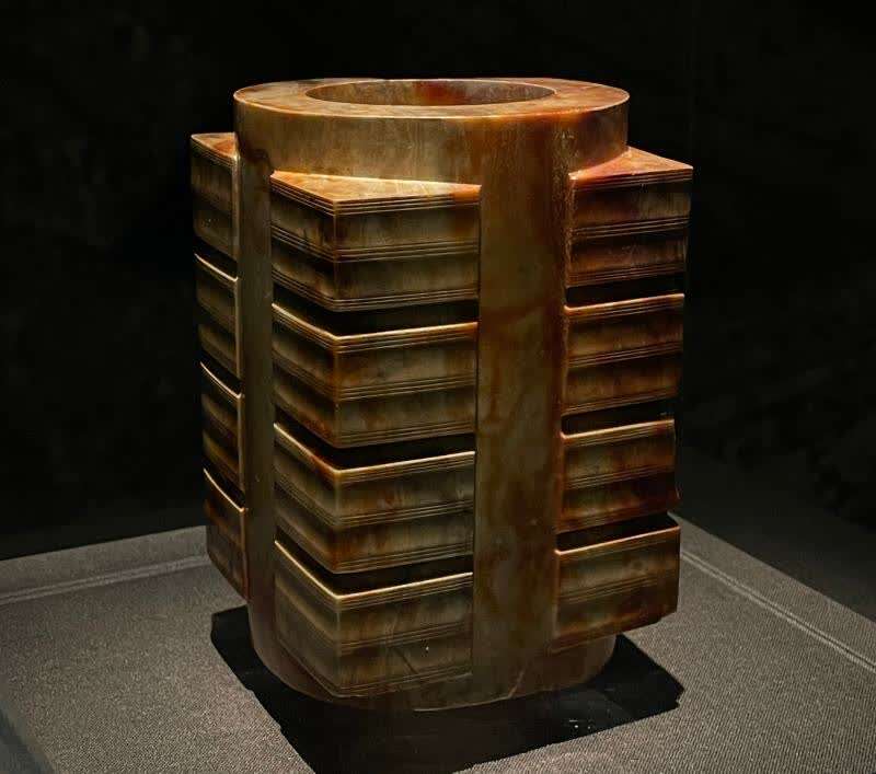 本次展览中,还有一件商周四节玉琮十分引人瞩目。玉琮重达3918克,由一块质地稠密的玉料琢磨而成,柱体外方内圆,凸面中间开横槽,使全器等分为四节,每小节刻画九道平直线纹。奇特的是,九道线纹分成三组,刻画十分平直规整,甚至于线与线之间的距离均接近等分,这在一个靠纯手工制玉器的年代不得不令人称奇。这件玉琮的形制与长江下游的良渚文化晚期玉琮的形制十分接近,但这两地相距遥远,当时是否也存在文化交流?这个问题值得寻味。