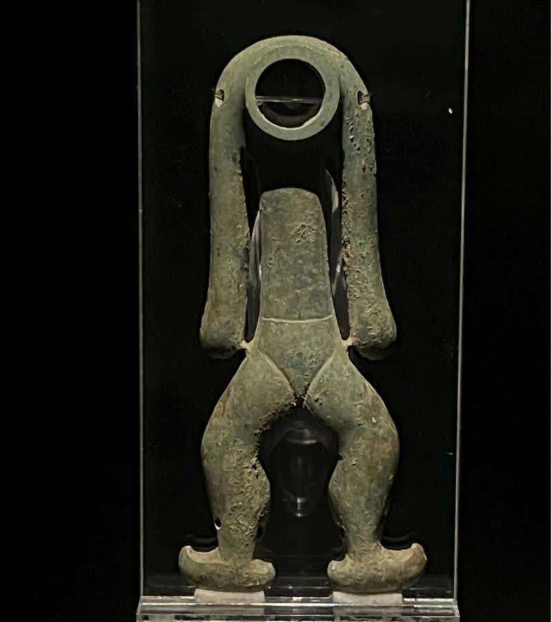 展览中金沙遗址出土文物展区内,有一件十分小巧的青铜人形器,其神奇的造型给观众留下了深刻印象。它长10.4厘米、宽4.6厘米、厚1.4厘米,青铜人呈站立状,双腿向两侧屈曲,双足外翻、足尖上翘。其腰身细长,双手下垂,颈部有一圆形窄沿孔洞,却没有头。它给大家带来无穷的想象,被许多小观众称为“太空人”。这种在古蜀文化遗存中首次发现的器物的出处和用途,还需要进一步研究和考证。