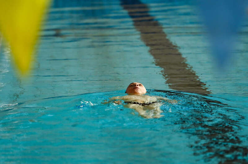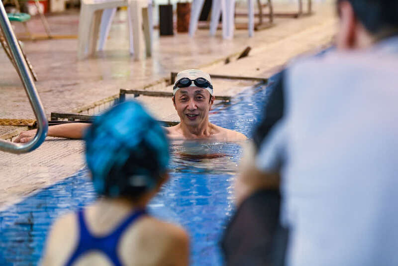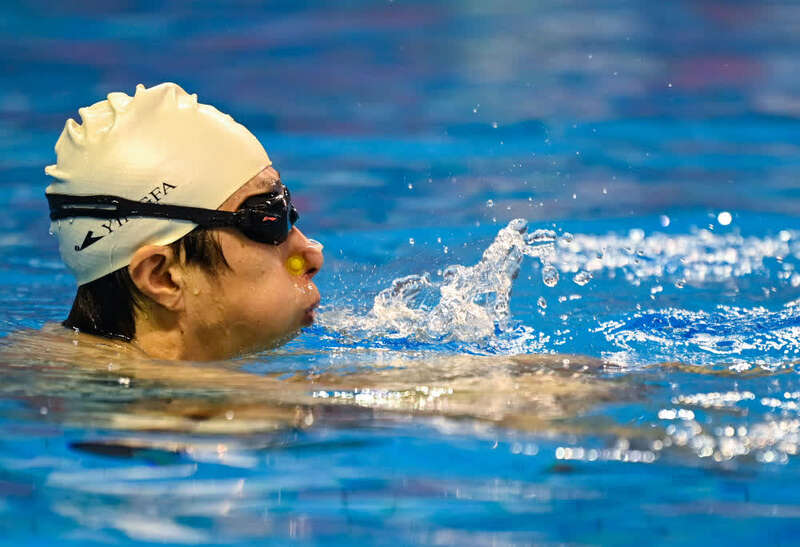 ↑耿耀志在四川省游泳馆内进行游泳训练(8月24日摄)。