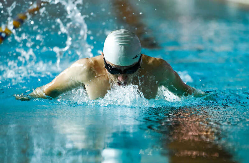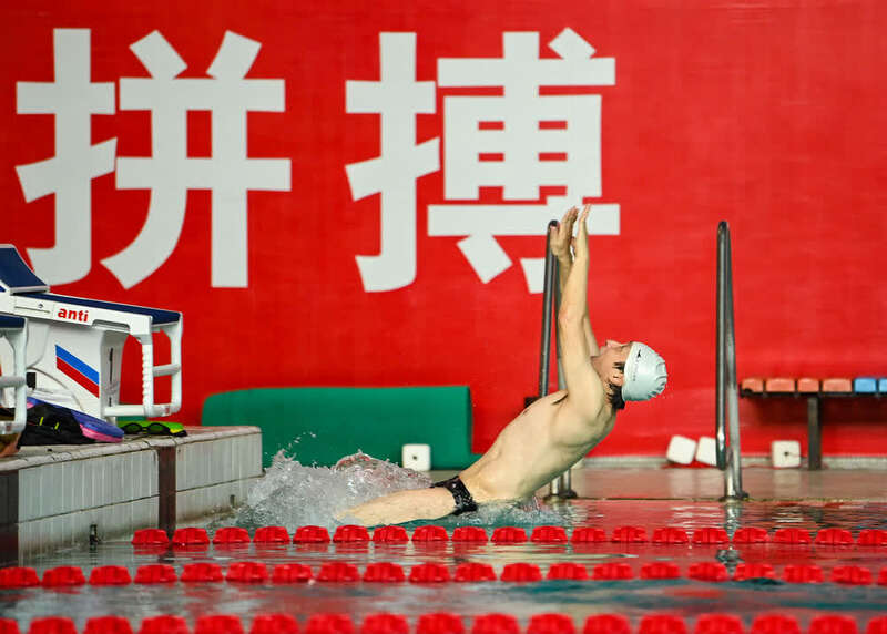↑耿耀志在四川省游泳馆内进行蝶泳训练(8月24日摄)。