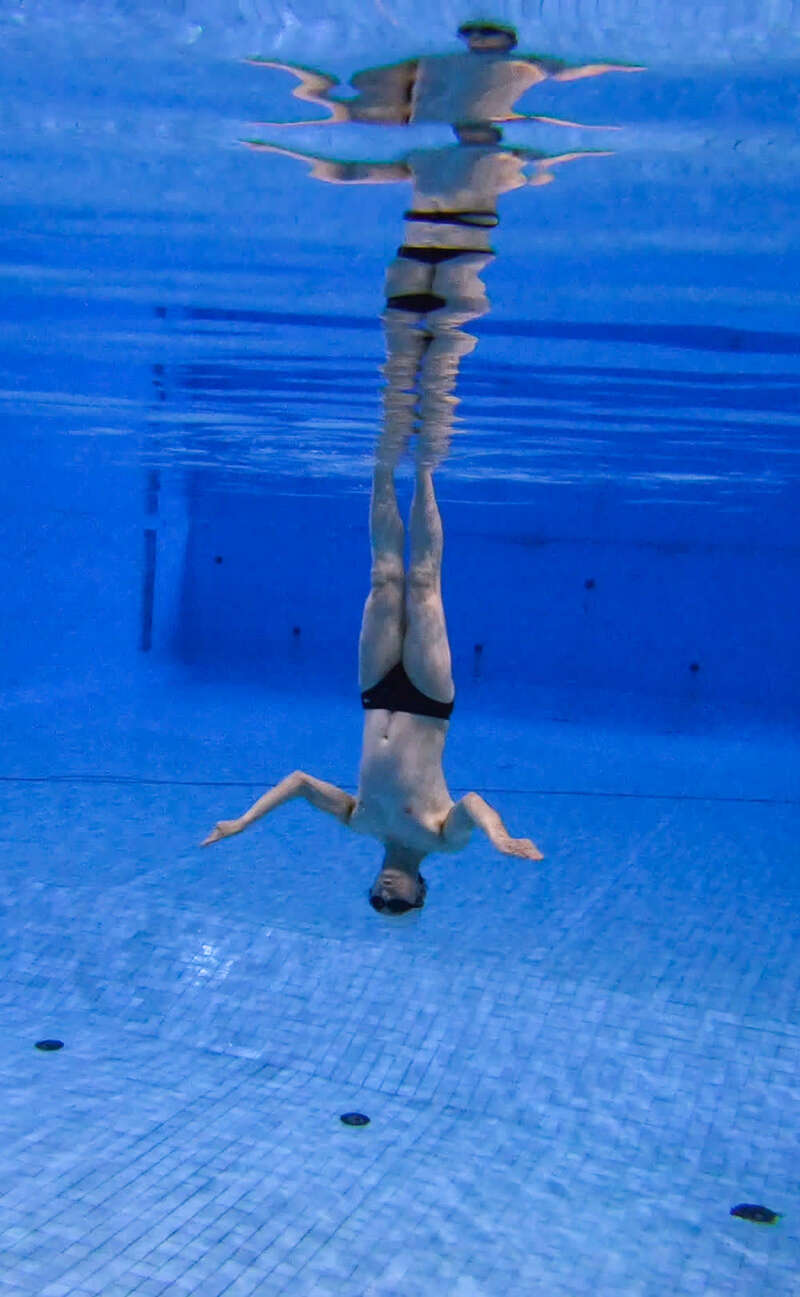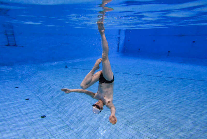 ↑耿耀志在四川省游泳馆内练习花样游泳的技术动作(8月26日摄)。