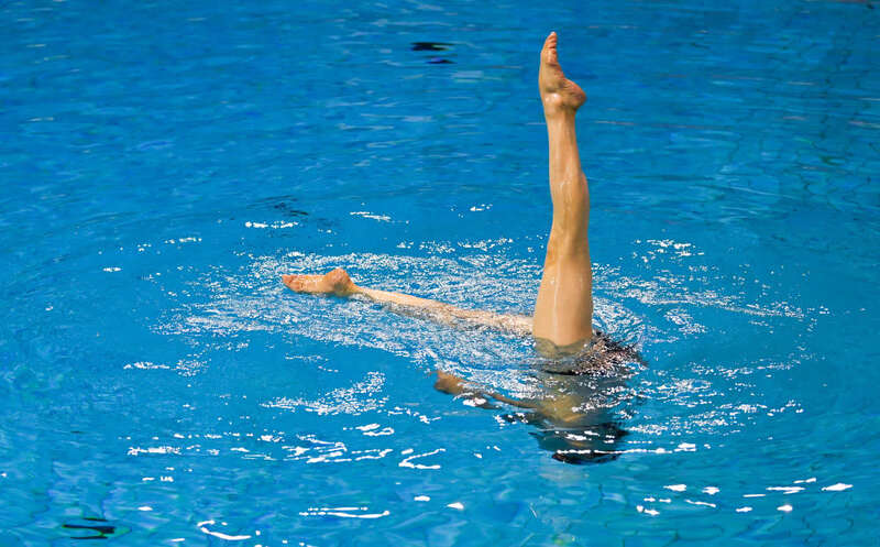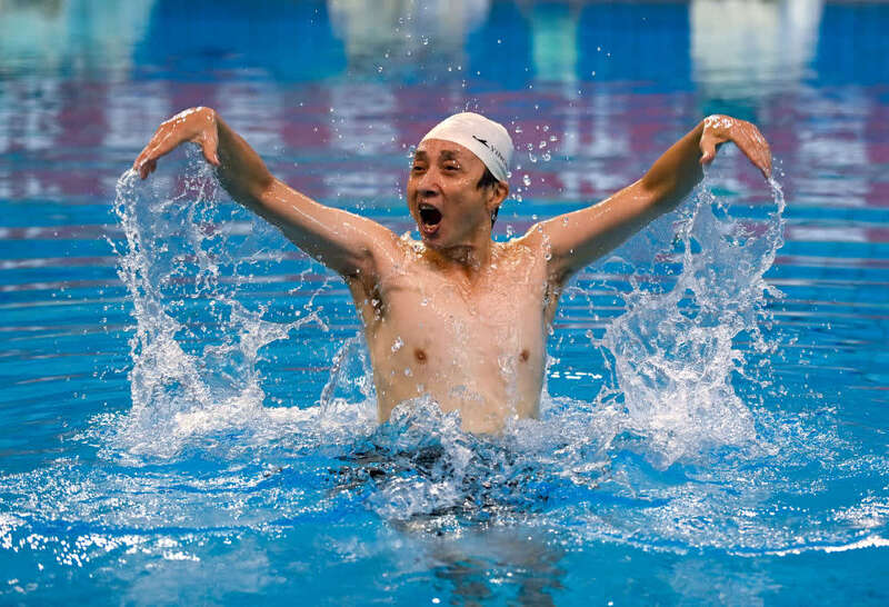 ↑耿耀志在四川省游泳馆内练习花样游泳的技术动作(8月24日摄)。