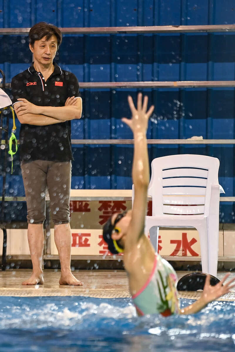 ↑耿耀志(左)观看四川省花样游泳队的队员们训练(8月26日摄)。