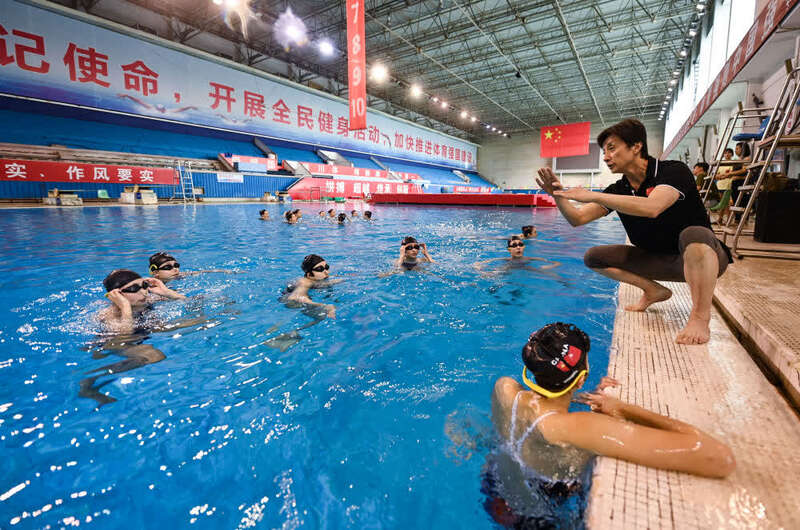 ↑耿耀志(中)在四川省游泳馆内与学习游泳的小朋友交流(8月26日摄)。