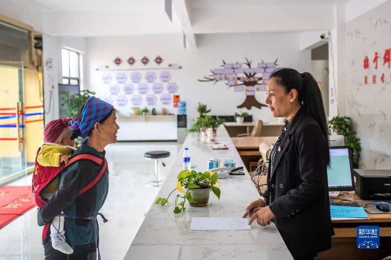 在宁蒗县幸福家园易地扶贫搬迁安置区,搬迁户苏解放莫向紫玛街道党工委副书记卢云花(右)咨询就业补助事项(8月25日摄)。新华社记者 胡超 摄