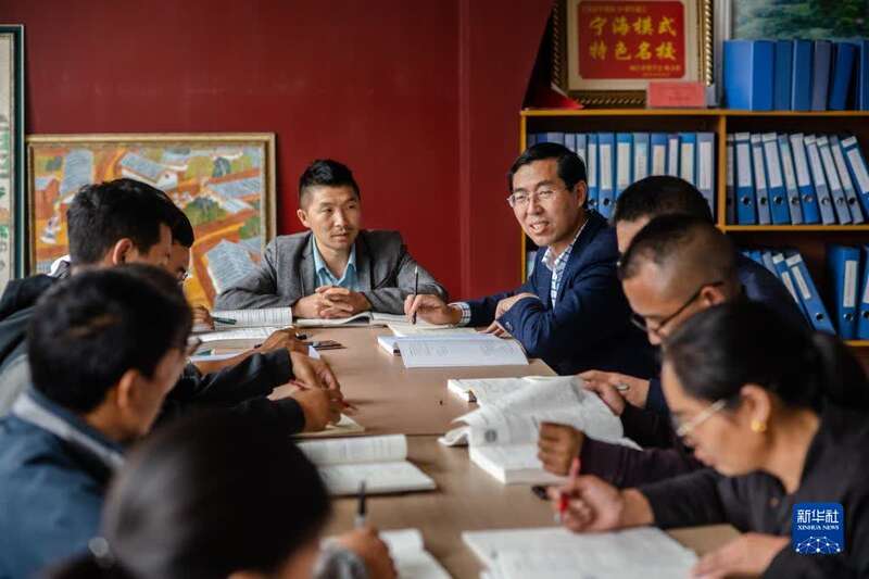 在宁蒗宁海民族中学,海安老师王拥军(右四)作为化学备课组组长和同事一起备课(8月26日摄)。新华社记者 胡超 摄