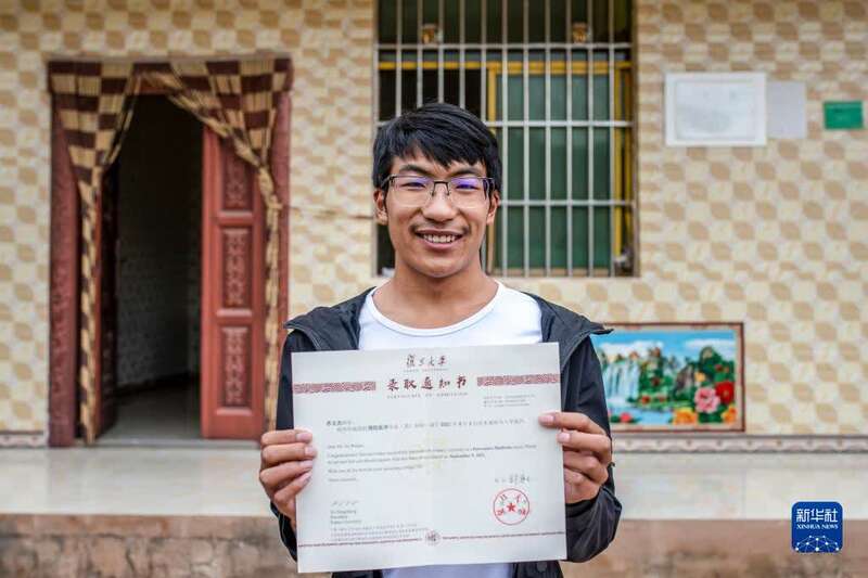 宁蒗宁海民族中学第三届“海安班”学生苏文杰展示不久前收到的复旦大学录取通知书(8月25日摄)。新华社记者 胡超 摄