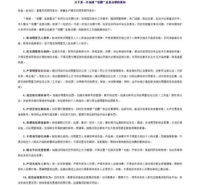 8月27日,中央网信办公开了《关于进一步加强“饭圈”乱象治理的通知》。其中要求,取消明星艺人榜单、优化调整排行规则、不得诱导粉丝消费、规范应援集资行为等。