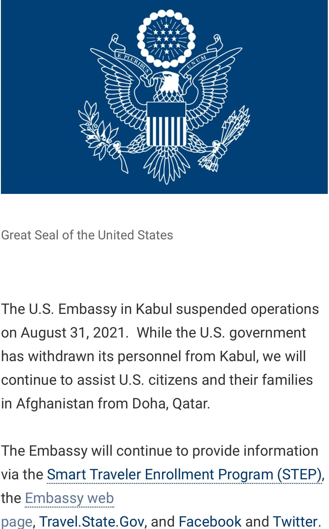 通告中表示,尽管美国政府已从喀布尔撤出相关人员,但仍将继续在卡塔尔多哈为阿富汗境内的美国公民及其家人提供帮助。