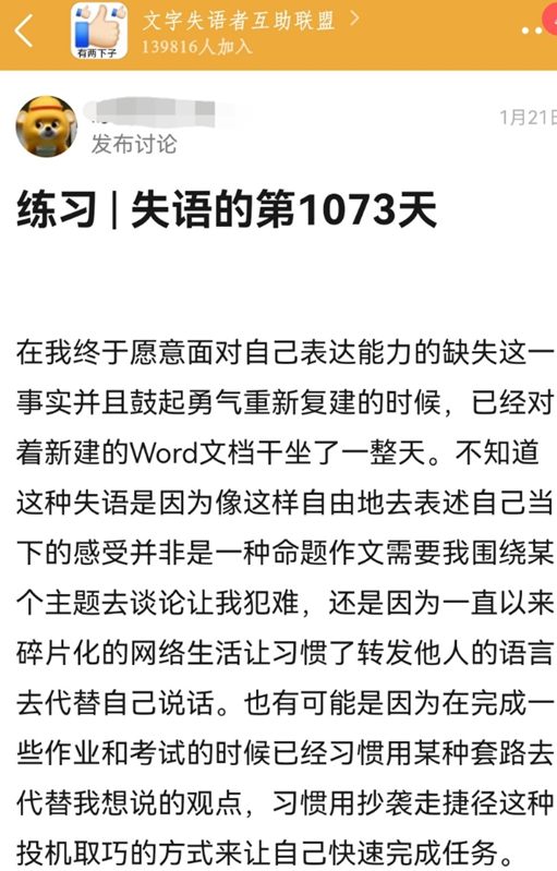 与高莹类似,杨逢意形容自己只是“偶尔会有想要复健的动力”。刚加入“文字失语者互助联盟”时,她曾发过两条复健练习的帖子,但各种庞杂的信息中,这个网络小组的坐标连同复健的决心很快被一起忘却:“要不是你来找我,我根本就忘记了我还加过这么个小组、有过强烈的复健想法。”