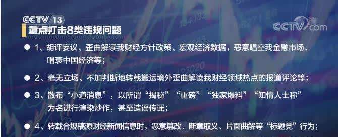 恶意唱空或哄抬个股价格,炒作区域楼市波动,扰乱正常市场秩序,网信办将封禁一批黑嘴自媒体,而除此之外,还将重点打击财经商业网站平台和自媒体存在的哪些问题?点击视频,一起观看!