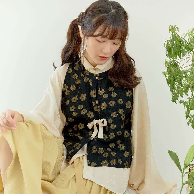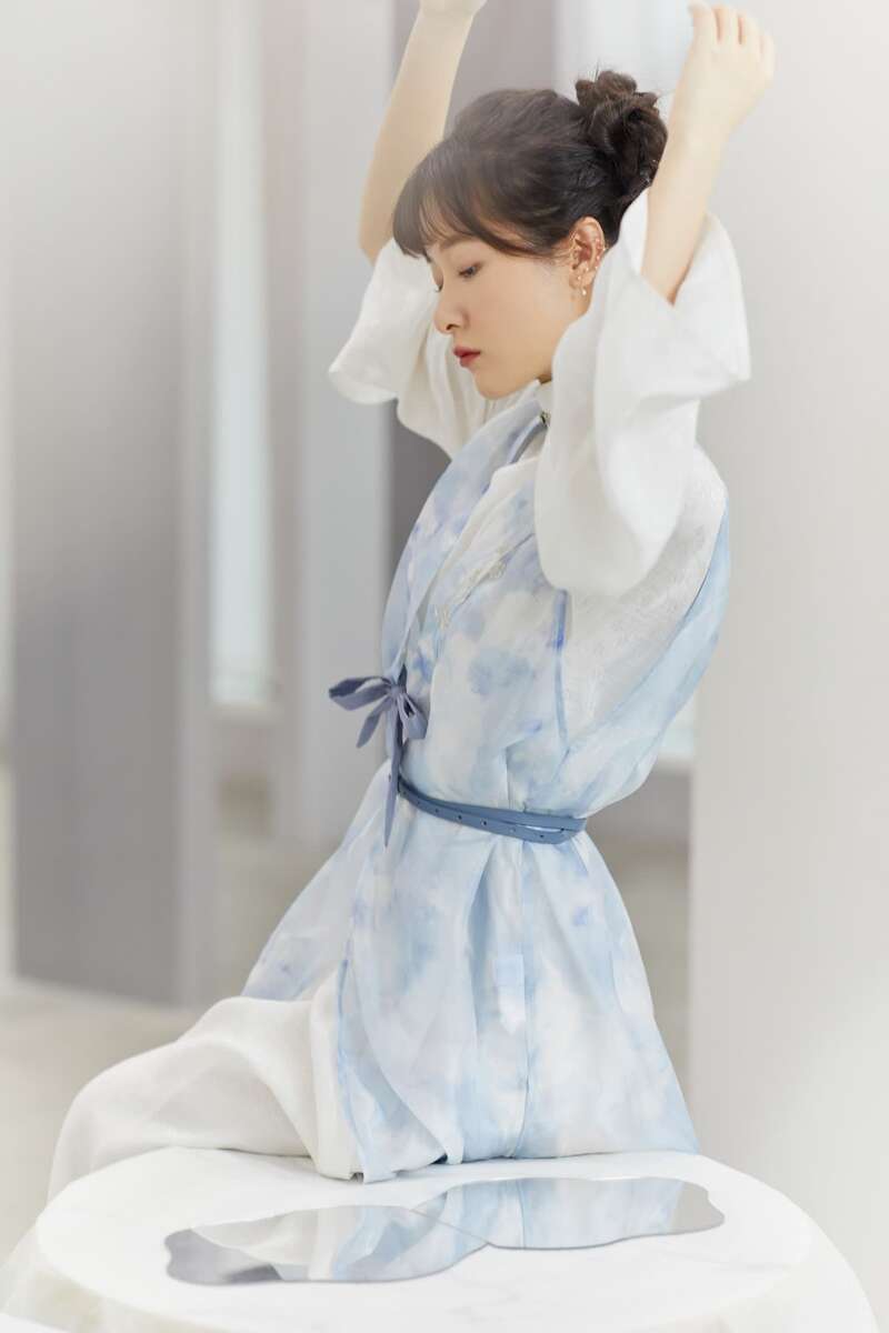 “梅雪烹茶”是一套明制汉元素,灵感来源于第四十一回众人前往栊翠庵品茶时,妙玉描述五年前在玄墓蟠香寺时,收梅花上的雪用来煮茶的场景。这件长比甲选用蓝色晕染效果的面料,再在领口用银线绣以梅花花枝,仿佛冬雪中的景色。蓝白配色清爽洁净,符合妙玉清冷高洁的人物形象。