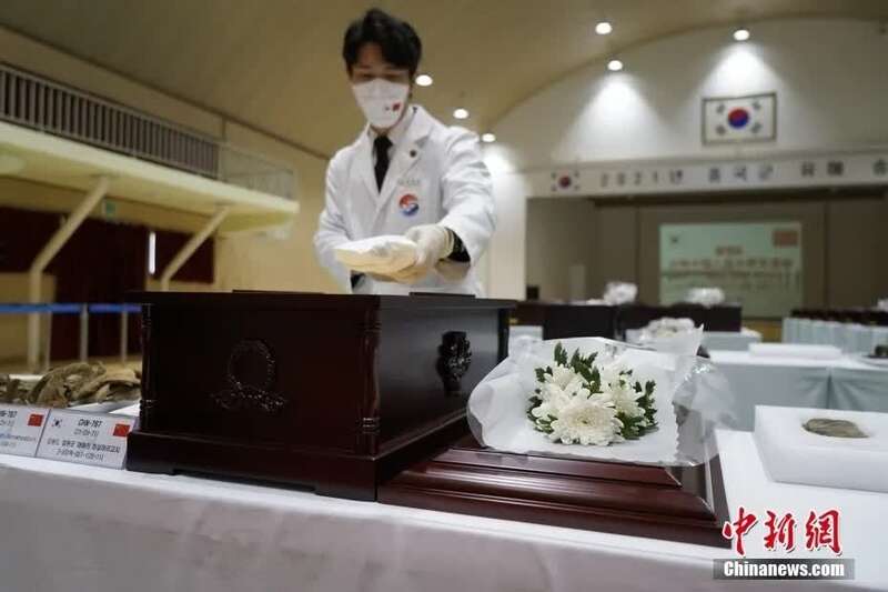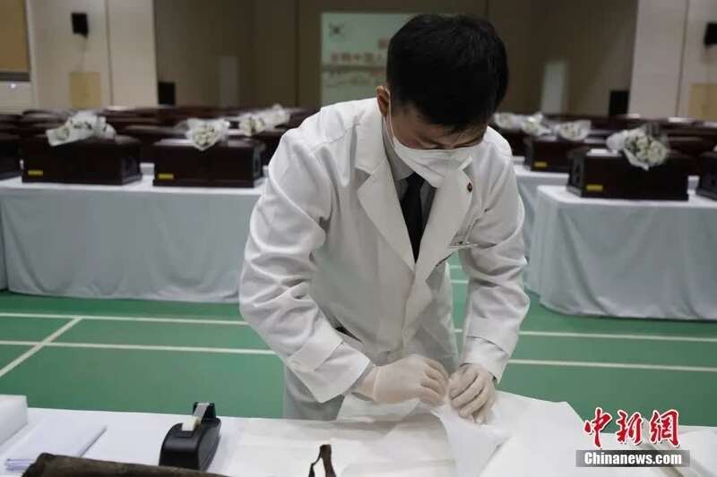 当天,位于仁川的“中国人民志愿军烈士遗骸临时安置所”内摆有花圈。中方代表现场进行了悼念活动。中方代表向烈士遗骸默哀鞠躬。随后,韩方人员身着白衣,用白纸包裹烈士遗骸,放入棺椁,并在棺椁外摆上鲜花。