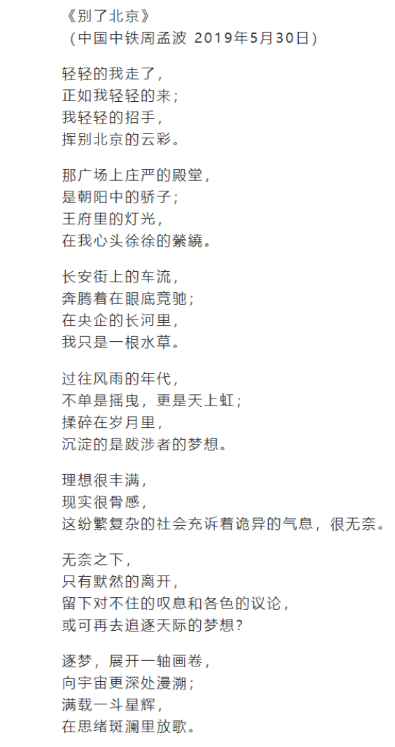 值得一提的是,当年6月,有自媒体公号发布题为《纵身一跃,架桥者浪漫的告别》的消息称,最近一段时间,基建人群里快速地传播着一首诗《别了北京》,署名为“中国中铁周孟波 2019年5月30日”。