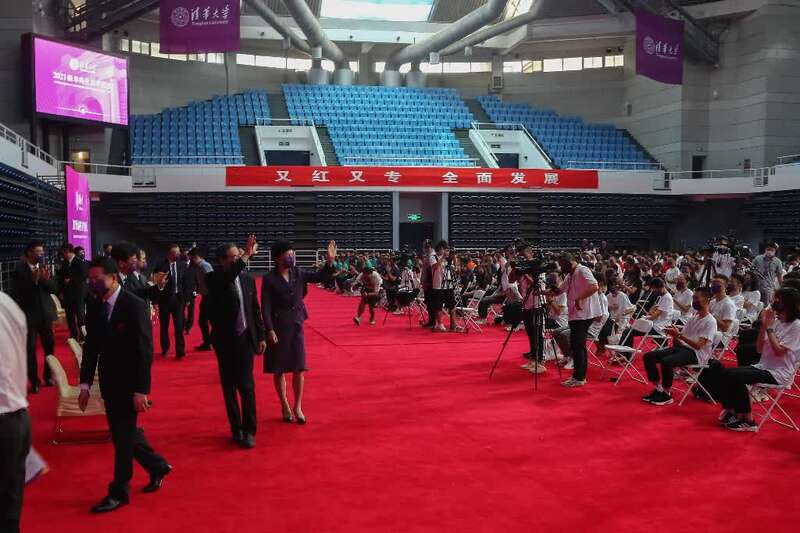 9月3日,北京,清华大学2021级本科开学典礼结束后,清华大学党委书记陈旭(中)向新生挥手致意。中青报·中青网记者 赵迪/摄