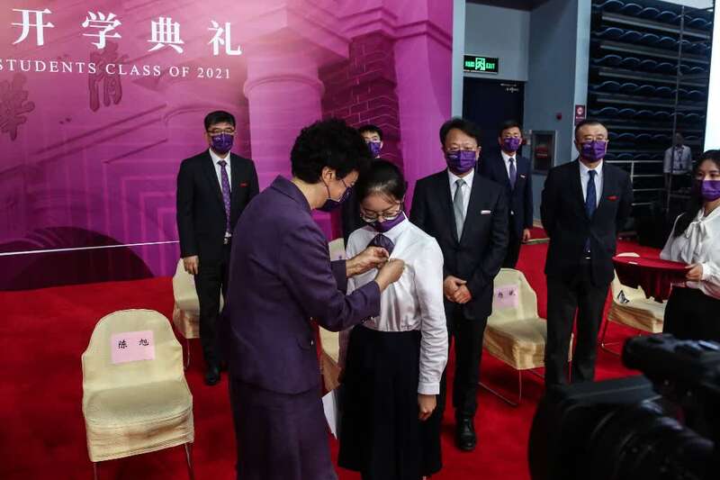 9月3日,北京,清华大学2021级本科开学典礼结束后,清华大学党委书记陈旭(中)为新生佩戴清华徽章。中青报·中青网记者 赵迪/摄