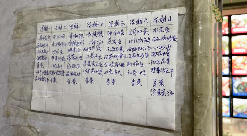在厨房里,记者看到一张为环卫工人列出的菜单。午餐标准是六菜一汤,六菜通常是三荤三素,有时也会调整为四荤两素。