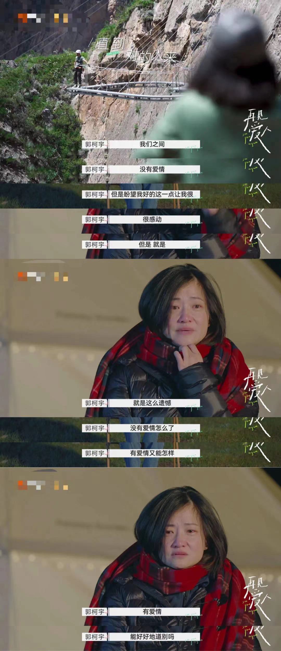 这个环节给节目带来了很多精彩的素材。不解风情的王秋雨摘下悬崖上的花,送给朱雅琼。章贺扯着嗓子大喊:“郭柯(宇),之前的十年,感谢你!真的感谢你。未来的日子,过成你喜欢的样子!一定要过成你喜欢的样子!我也是!我也要过成我想过的样子!”隔着墨镜,郭柯宇抿着嘴努力微笑,眼泪落下来,心绪复杂。