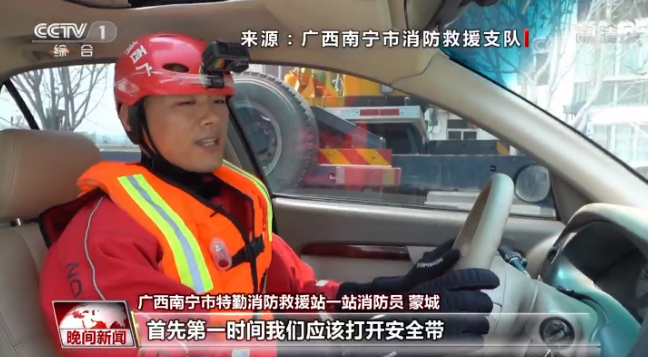 广西南宁市特勤消防救援站一站消防员 蒙城:第一时间我们应该打开安全带,第二再把车辆的电子锁打开,电子锁打开之后我们再把天窗打开。