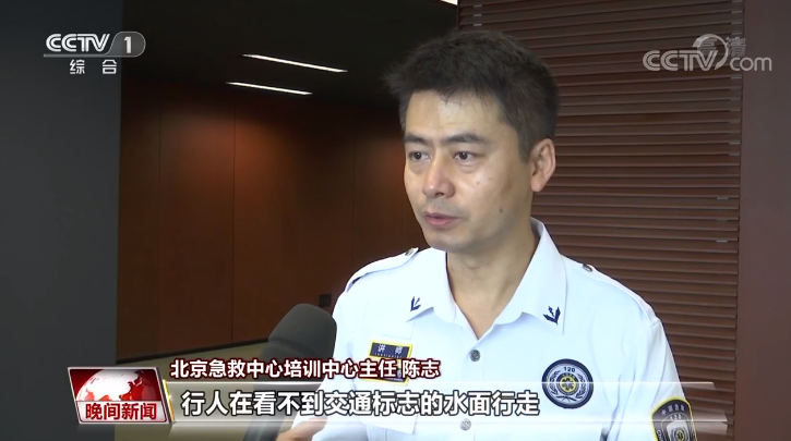 北京急救中心培训中心主任 陈志:行人在看不到交通标志的水面上行走,最好手里有个竹竿向前探路。如果水在我们脚踝,这时候我们看不到路面情况;如果水到了膝盖,就已经非常危险了。如果水到了腰部,在水中实际上已经无法掌握自身的平衡,如果水已经到了膝盖,我建议大家要暂停在路面上行走,要首先去安全的地点躲避。