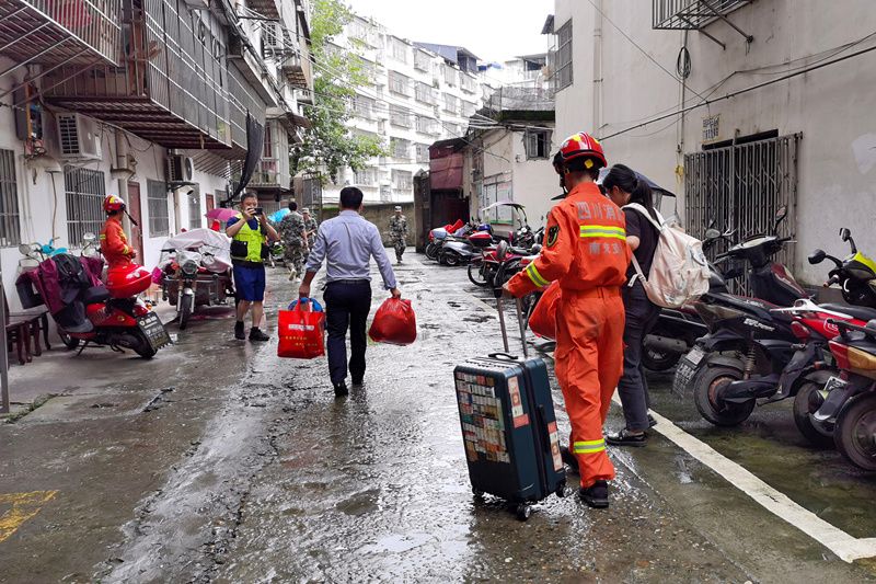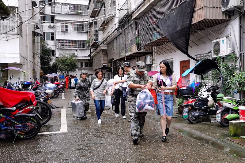 2021年9月5日,四川南充阆中市,保宁街道办事处观音路社区发生堡坎滑坡。民兵应急分队在组织居民转移。