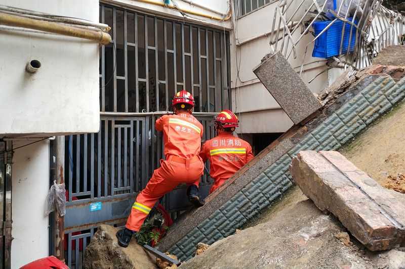 2021年9月5日,四川南充阆中市,保宁街道办事处观音路社区发生堡坎滑坡。消防救援人员在逐户搜寻被困人员。