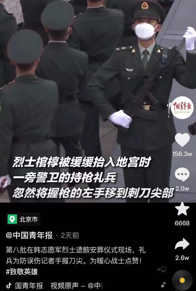 视频经中国青年报发布后,截至目前,视频播放近2700万次,获赞超百万!有网友评论:刺刀向敌人,温柔留给人民。