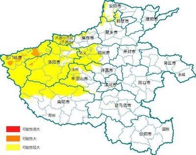 地质灾害预警预报达到橙色预警的地区为:三门峡西部及北部,洛阳西部局部,发生地质灾害的可能性大。