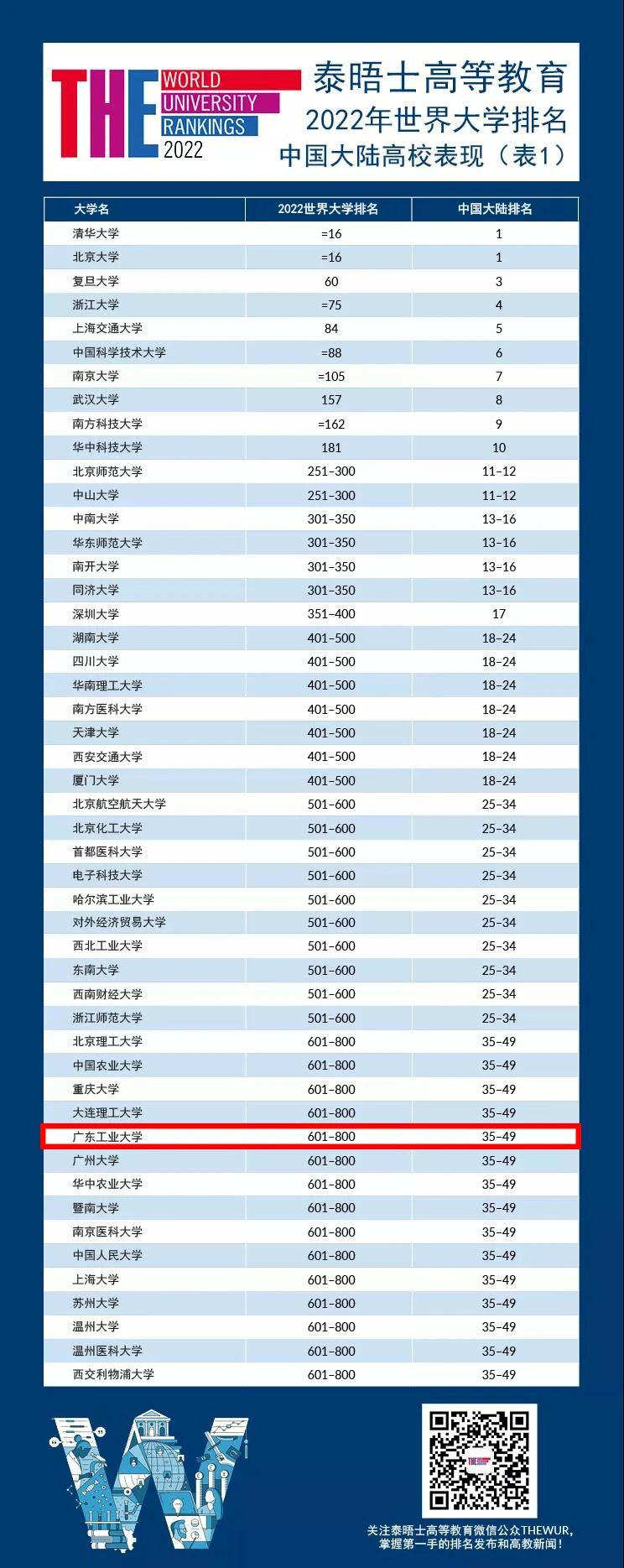 今天上午,泰晤士高等教育(Times Higher Education) 发布了2022年泰晤士高等教育世界大学排名。广东工业大学在泰晤士大学排名榜中位列世界总排名601-800区间;在中国大陆高校排名第35-49名。