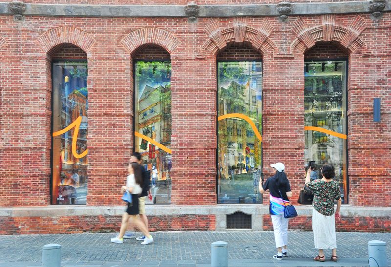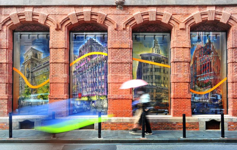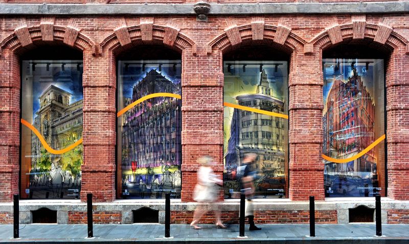 2021年9月5日,上海,北京东路圆明园路外滩源的老建筑橱窗里出现了一幅幅历史建筑的彩色速写作品,吸引游客纷纷观赏留影。