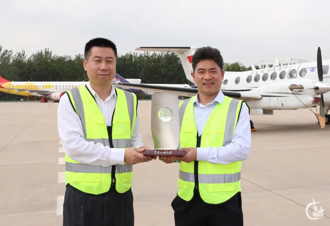 双方做好资产移交,校飞中心将飞机钥匙转交给中国民航大学,学校回赠校庆纪念品。
