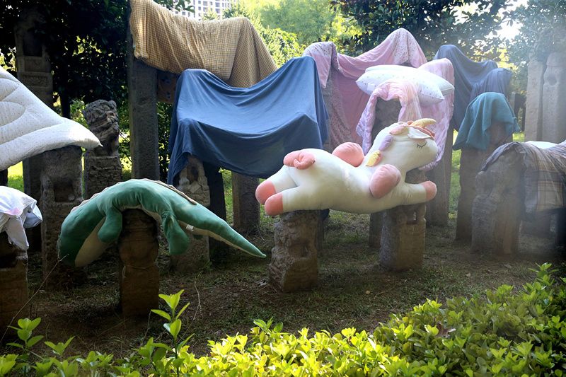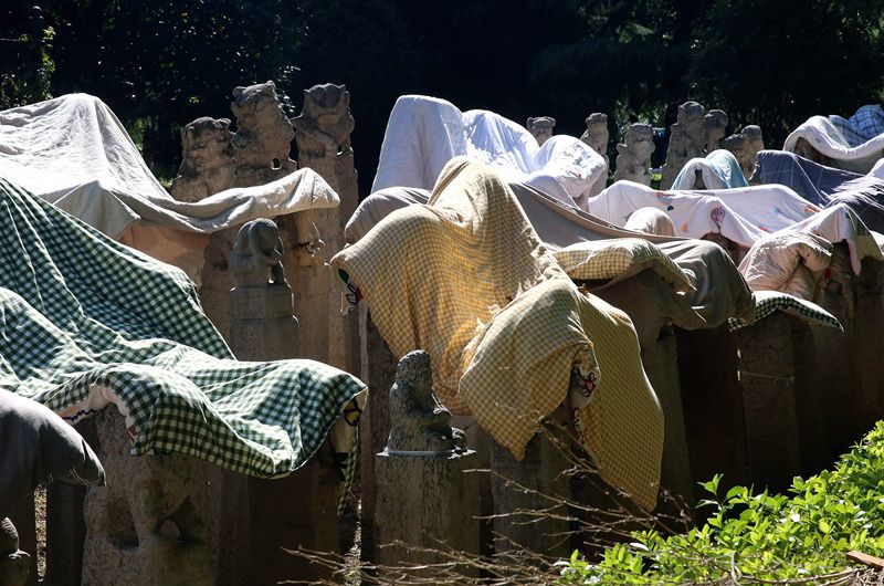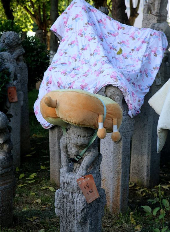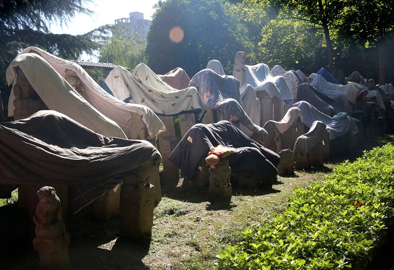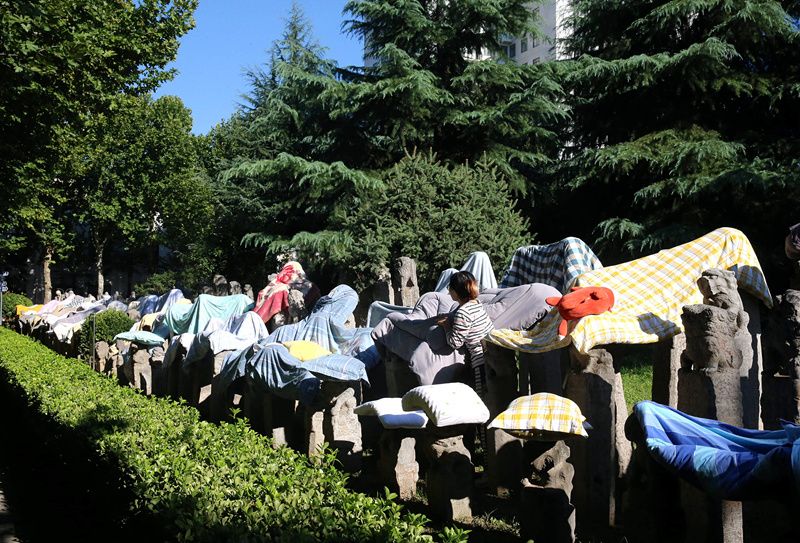2021年9月7日,陕西省西安市,连日阴雨天气过后,西安美术学院校园内的数千个拴马桩成为大学生晾晒衣物的“神器”。