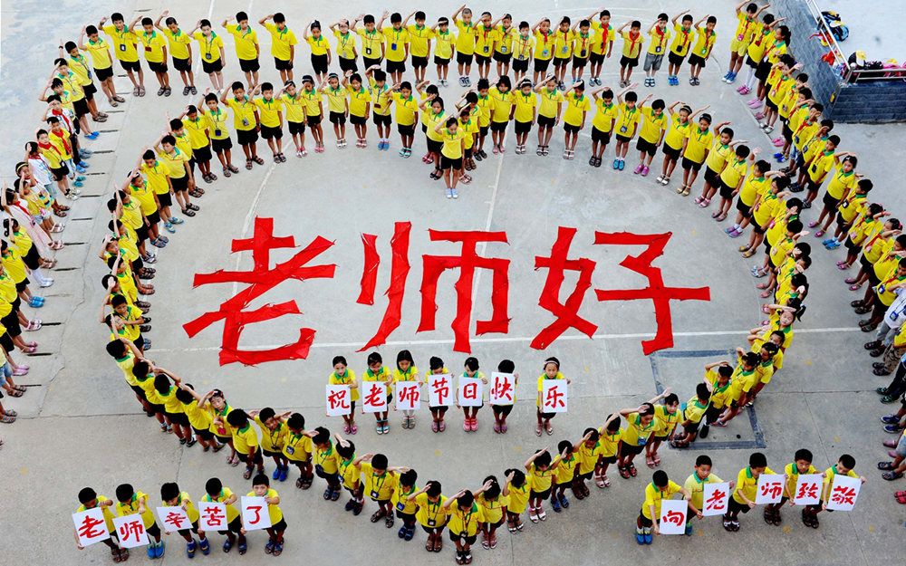 2019年9月9日,浙江金华,在教师节来临之际,浙江省东阳市职教中心东技校区为该校老师举行了一场“教师节”感恩活动。学生统一着装,排列出“老师辛苦了”字样表达对老师的感激之情。