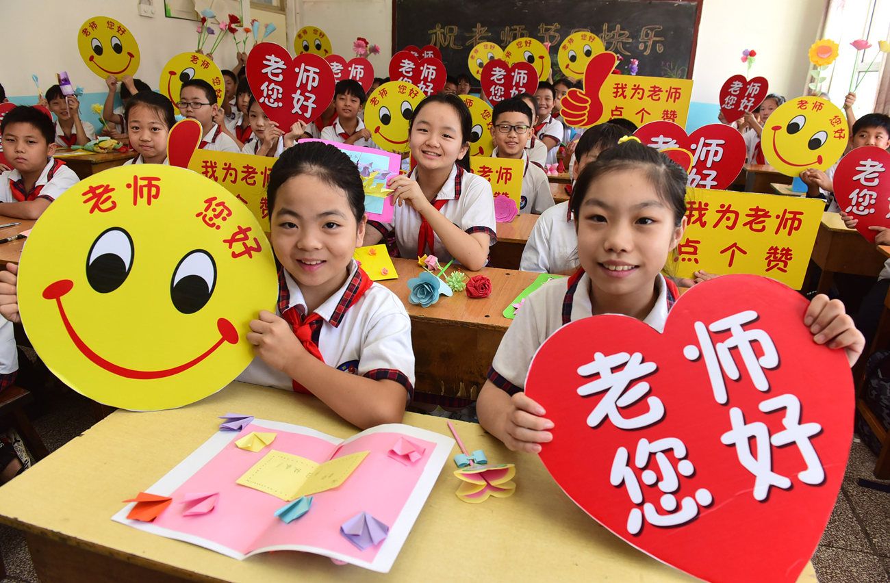 2020年9月10日,石家庄,新乐市实验小学五年级3班同学展示准备送给老师的笑脸和手工艺品。